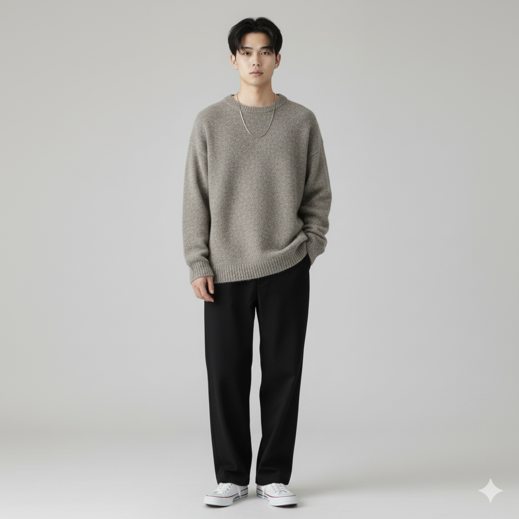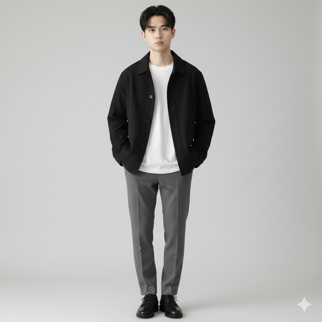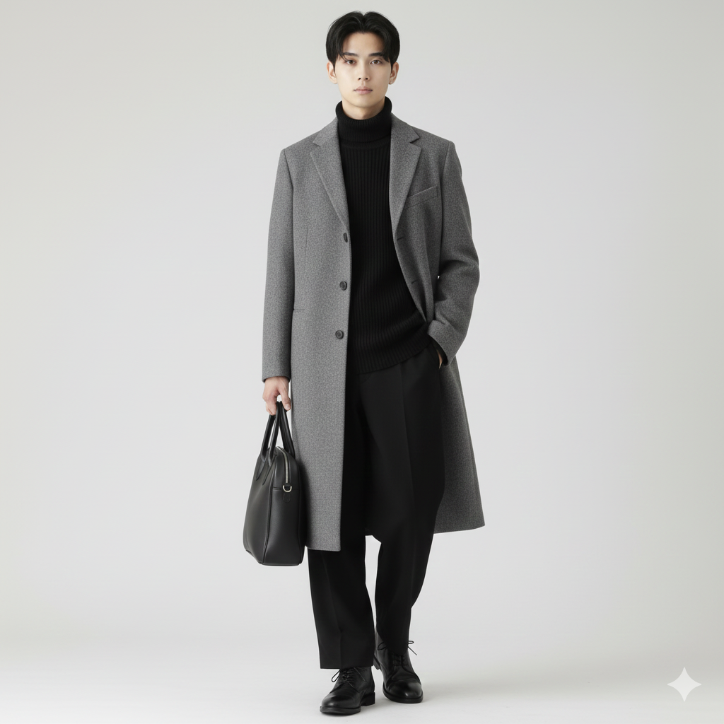 ポイント: 冬の本格モードスタイル。ロングコートを羽織るだけで一気に大人っぽさが増します。全身モノトーンでまとめつつ、コートのグレーで重さを軽減。レザー小物で統一感を出すのがポイントです。デートや特別な日におすすめ。